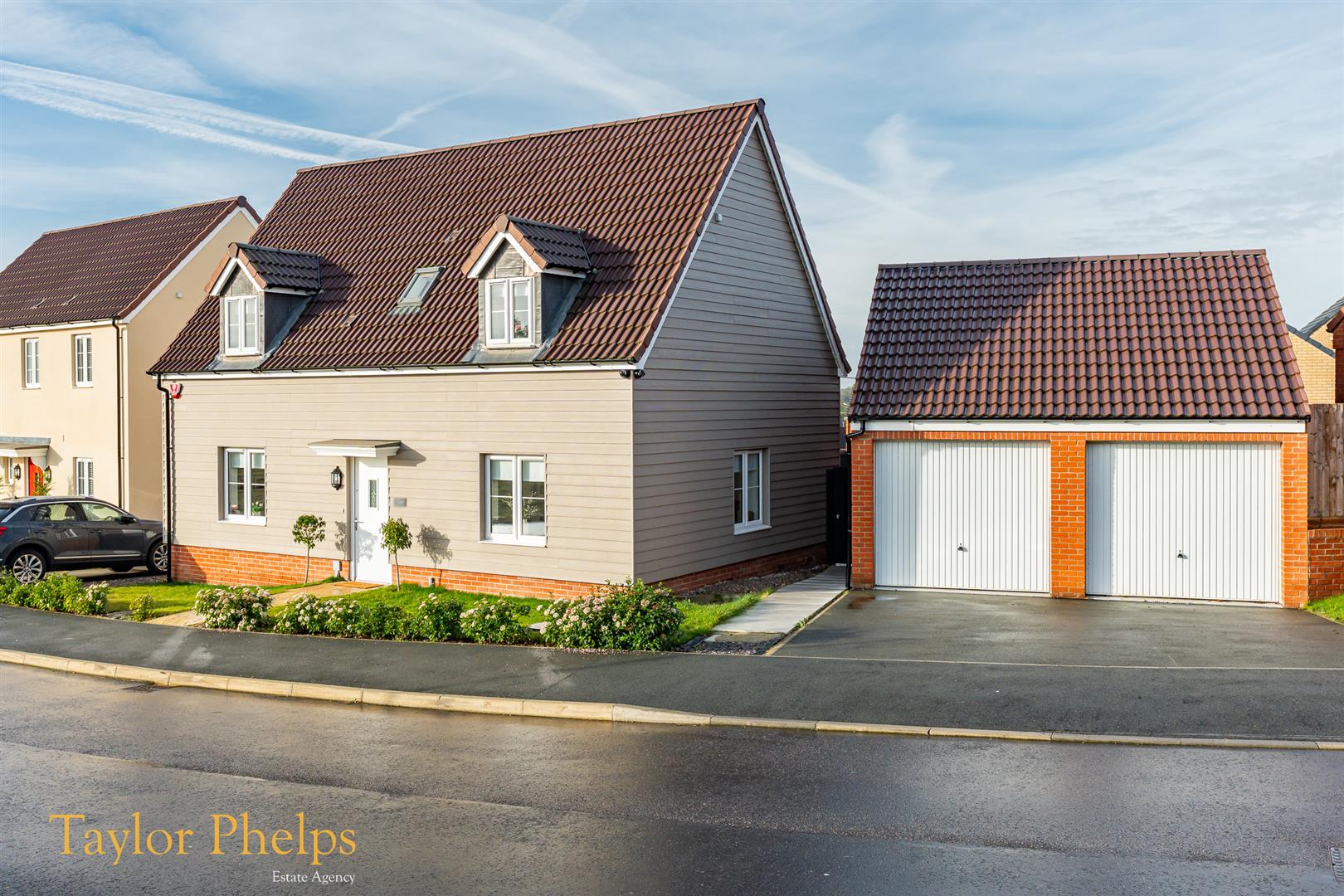 Exterior Landscaped Rear garden with patio area. Double garage to side with off street parking