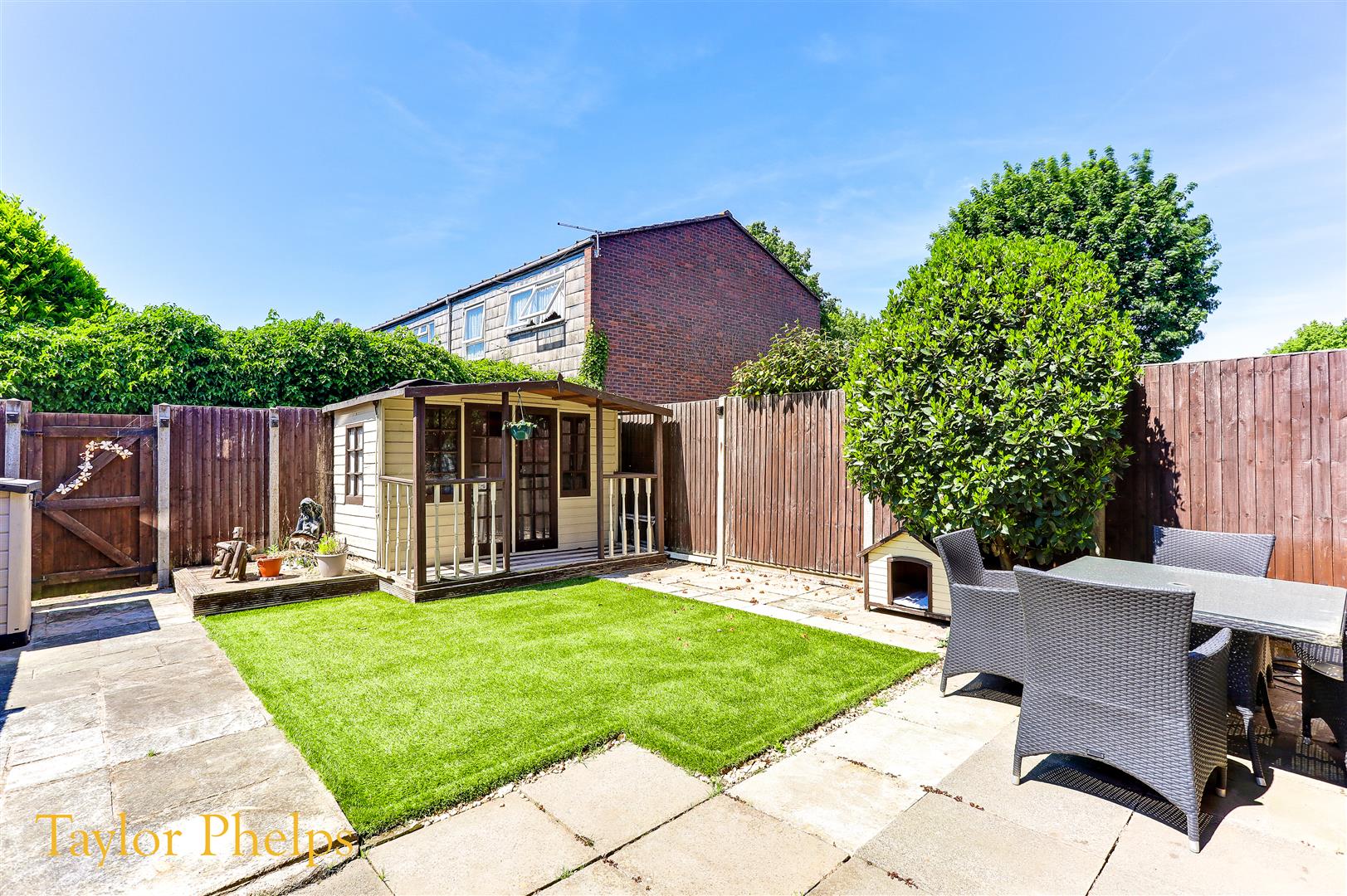 Exterior Rear garden with artificial lawn and patio area.
